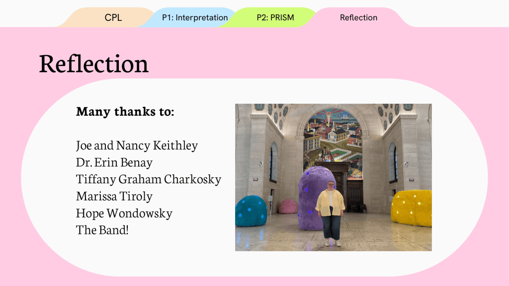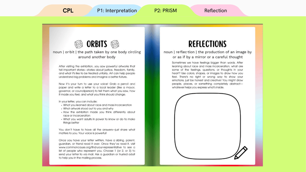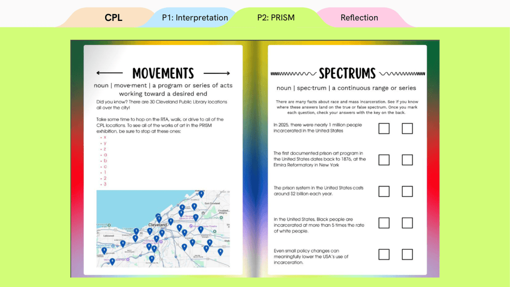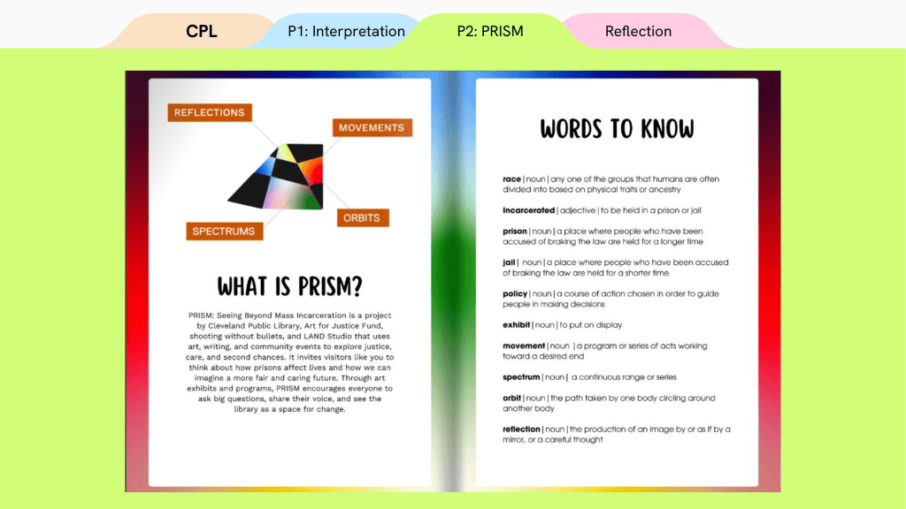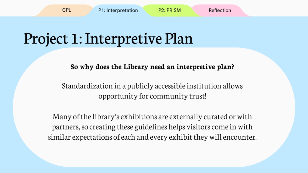 The first was to create an interpretive plan (accessibility guidelines to follow when creating an exhibition) for the library to standardize their exhibition practices. This includes label writing, language guides, and accessibility amongst many other aspects. The second is working with partner non-profits (LAND Studio and shooting without bullets) and artists on in-gallery resources and materials for the upcoming exhibition series “PRISM: Race and Mass Incarceration.”